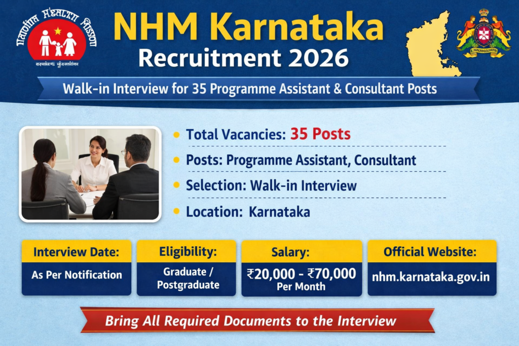 The NHM Karnataka Recruitment 2026 notification has been released for 35 vacancies including Programme Assistant and Consultant posts. The recruitment will be conducted through a walk-in interview, making it a great opportunity for candidates looking for government jobs in the health sector without going through a lengthy application process. Eligible candidates can directly attend the interview with required documents on the scheduled date.